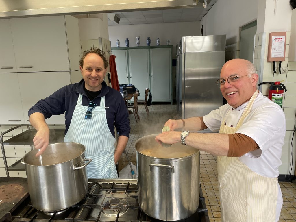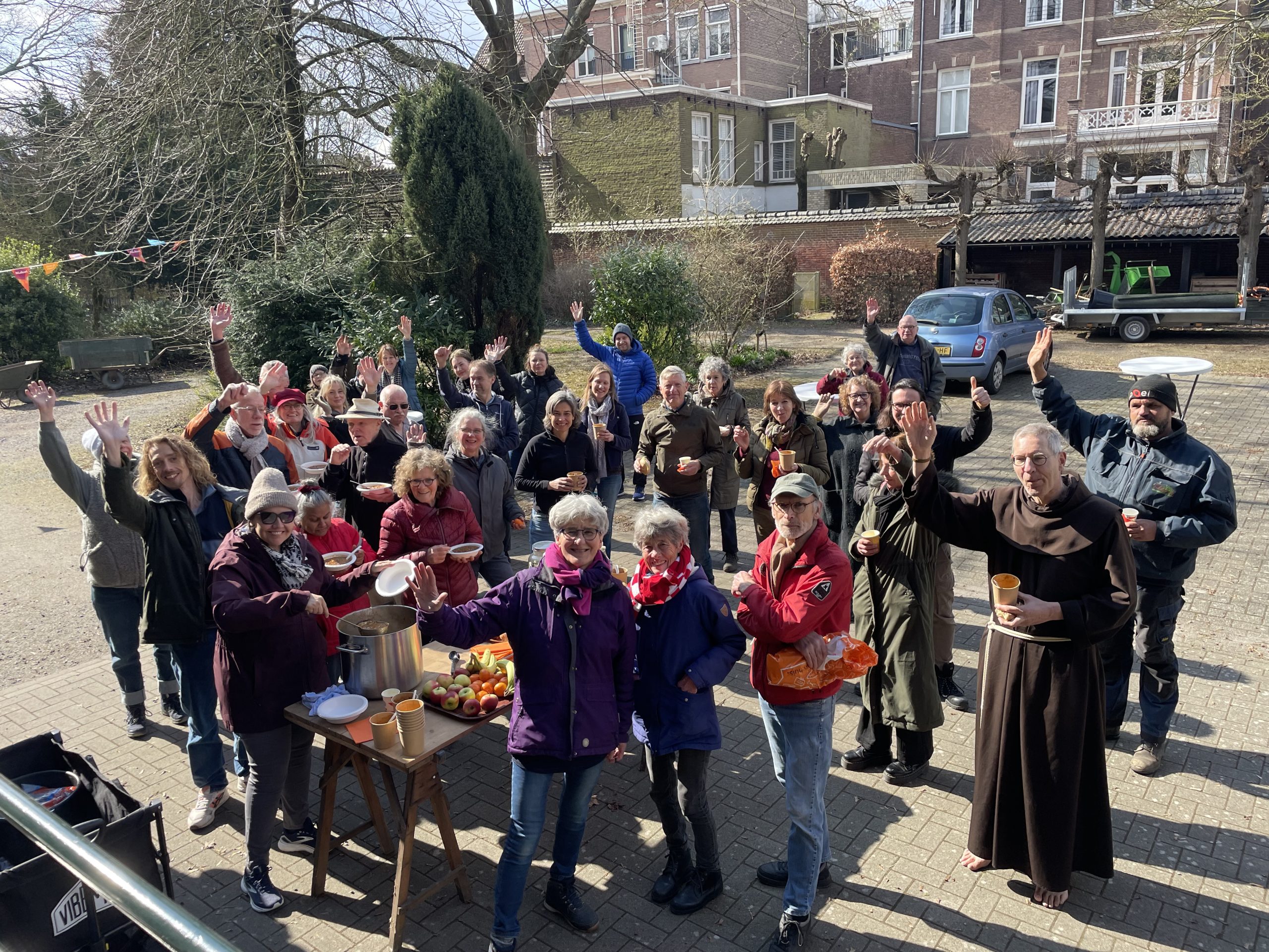 Na het opknappen van onze buurt, hebben de bewoners en vrijwilligers samen geluncht in de tuin van Stadsklooster San Damiano. In deze tuin werd ook de hele ochtend gewerkt door vrijwilligers uit ‘t Zand en van buiten de buurt.