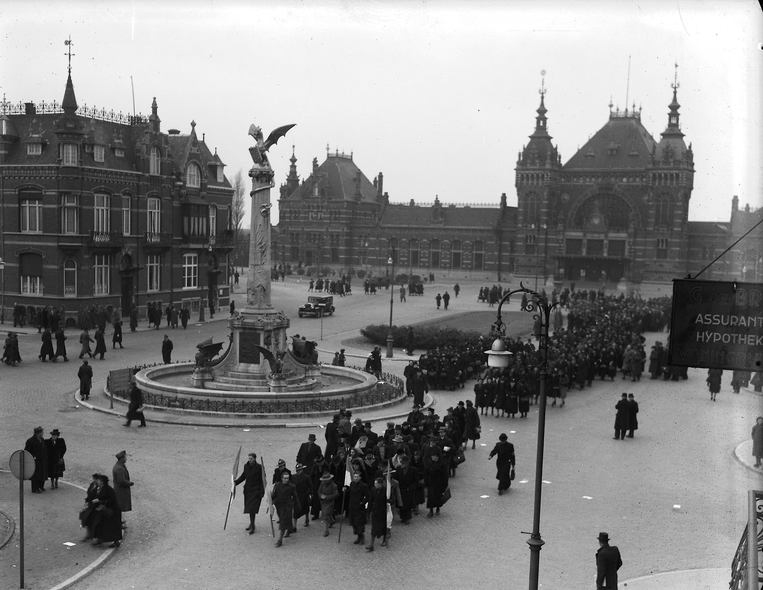Deze foto is gemaakt op 11 februari 1940 op het Stationsplein. We zien bedevaartgangers uit het centraal station op de achtergrond lopen.