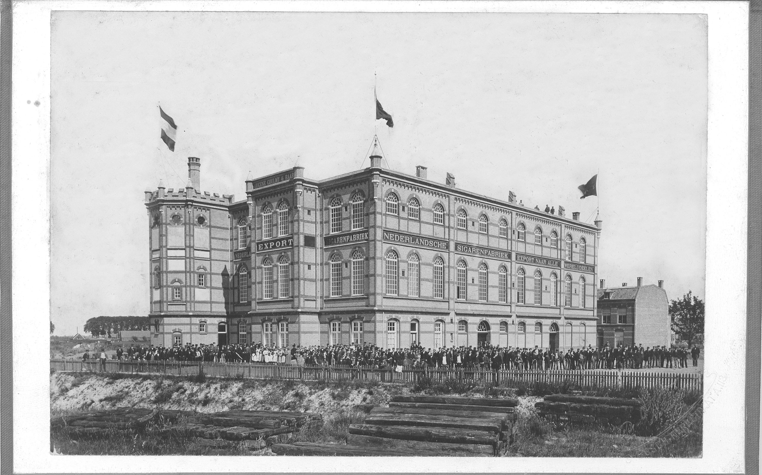 Deze foto is genomen in 1898 tijdens de feestelijke opening van de nieuwe Goulmy & Baar sigarenfabriek in ’t Zand. Tegenwoordig ook wel bekend als de Willem II-fabriek.